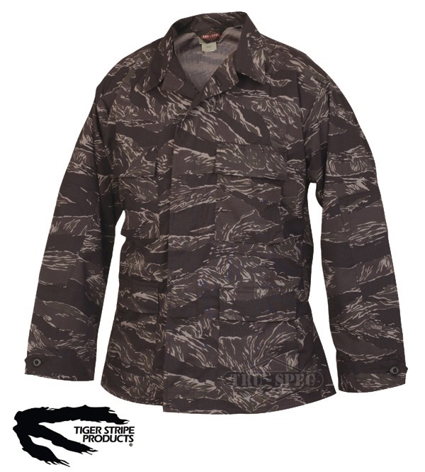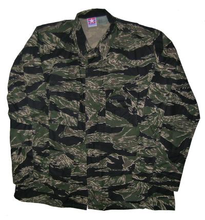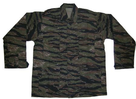tiger stripe pattern BDU jackets.4 pocket 100 % cotton ripstop. Sizes XSMALL-XL $42.95, XXL-XXXL $45.95