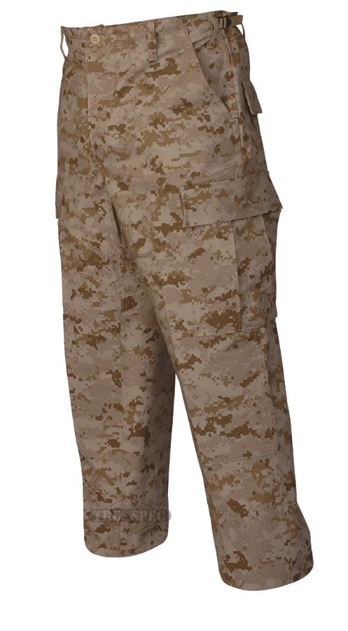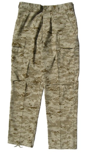 Digital desert camouflage 6 pocket BDU pants. 55/45 poly-cotton twill. Sizes Small, Med, Large, XL $29.95 Size XXL $34.95