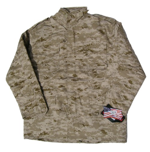 digital desert M65 jacket. Water repellant poly/cotton twill, concealed hood, removable quilted button-in liner. $79.95 Sizes XS-XL