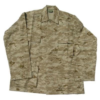 Digital desert camouflage BDU jackets. 55/45 poly-cotton twill. Sizes Small, Med, Large, XL $29.95 Size XXL $34.95