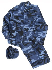 ME1.Middle East Police Blue Urban camouflage set with cap. Shirt is 2 upper pockets with epaulettes. Pants have 2 front pockets and 1 back pocket. Nylon blend. Available in sizes XL and XXL. $99.95