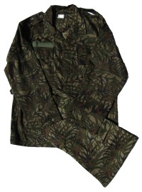 ZIM1.Zimbabwe Portugese pattern camouflage set. Shirt has 2 upper pockets. Pants have 3 front pockets, 2 cargo pockets. Shirt size 16, pants size 32. unissued. $150.00 |