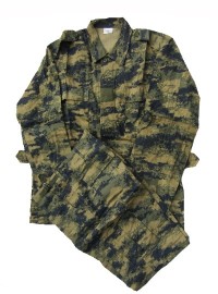ME3. Digital Urban camouflage set. Shirt is zip up with velcro closure, Collar has pull tab, 2 upper zip close slant pockets , 2 sleeve zipper pockets. Pants are zip up with button top and have 2 front pockets, 2 zipper close back pockets, 2 zipper close cargo pockets. Maker marked Jungle Front. 100% cotton ripstop. Available in sizes XXL, and XXXL. $119.95 |