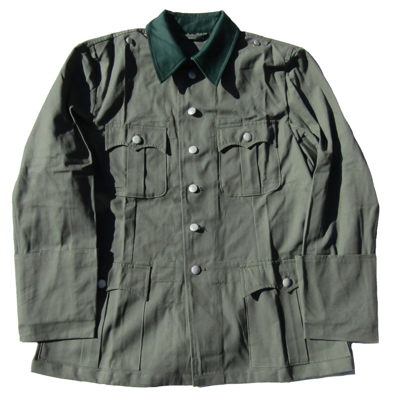 field gray wool M43 tunic. These tunics have all the details of the originals: 6-button front, hook and eye collar, belt hook holes, acetate lining, split cuffs, collar bind buttons, first aid dressing pouch, shoulder board loops, etc Available in sizes 40, 42 ,44 ,46 ,48 ,50. Comes with either SS or Army insignia, your choice. shoulder boards , collar tabs , sleeve or breast eagle. $139.95 |