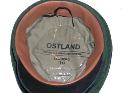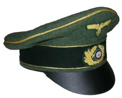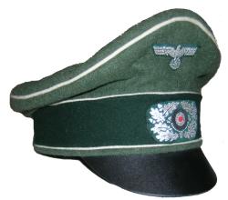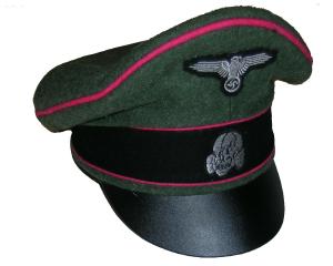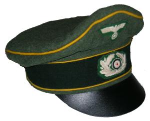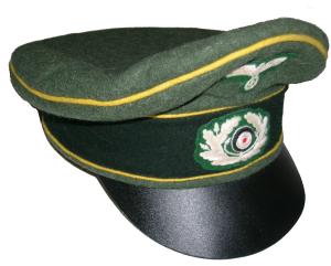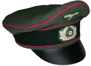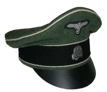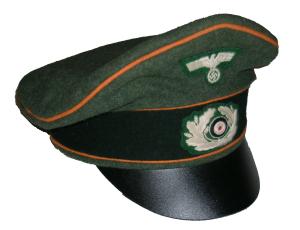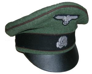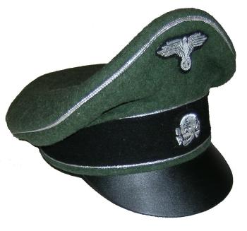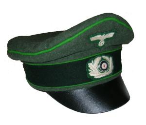 Field gray wool body with Green piping, leather visor, bevo silver cap eagle and cocarde. |