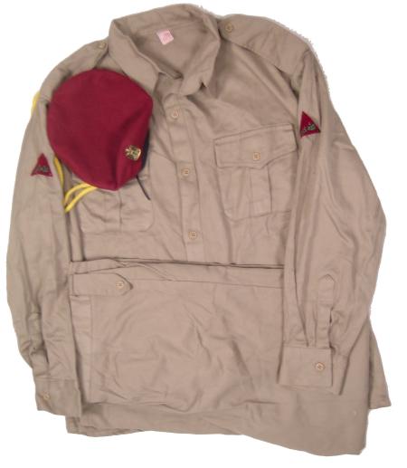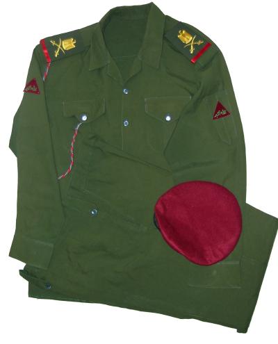 | IU18.Iraqi Army / Republican Guard tan desert color uniform. Jacket and pants. Size XL. Comes with sleeve patches, shoulder cord, beret size 58. Saddam era, Iraqi made. $225.00 |