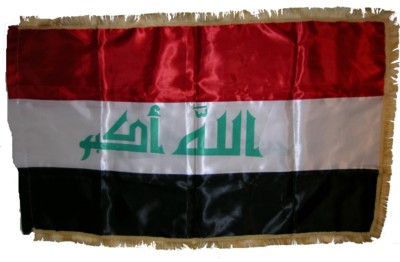 | IF2.New Iraqi flag without stars and with gold fringe. Size about 47 x 28 inches. 2 sided, multi piece construction, Iraq made. $45.00 |